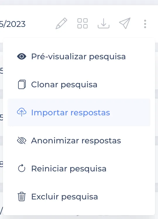 A partir da tela onde fica a lista de Pesquisas, clicando em uma das pesquisas (…) e selecionando a opção Importar respostas