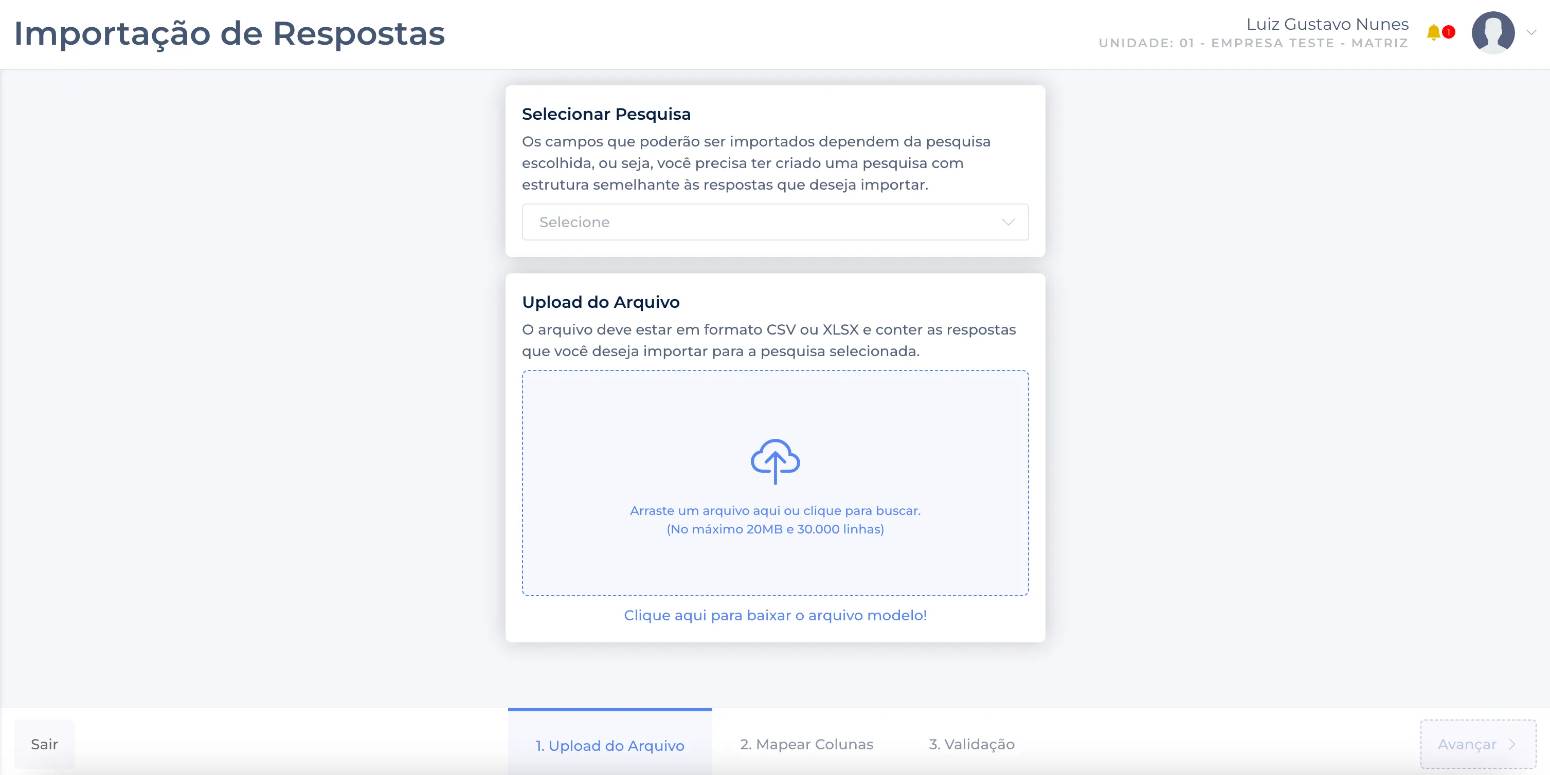 Recomendamos que seja criada uma nova pesquisa separada apenas para a importação das respostas, para manter a importação separada do restante das respostas.