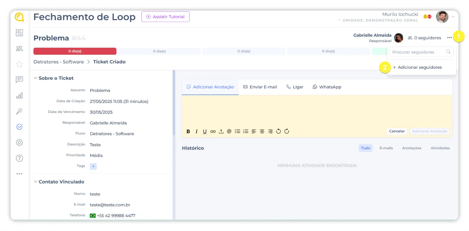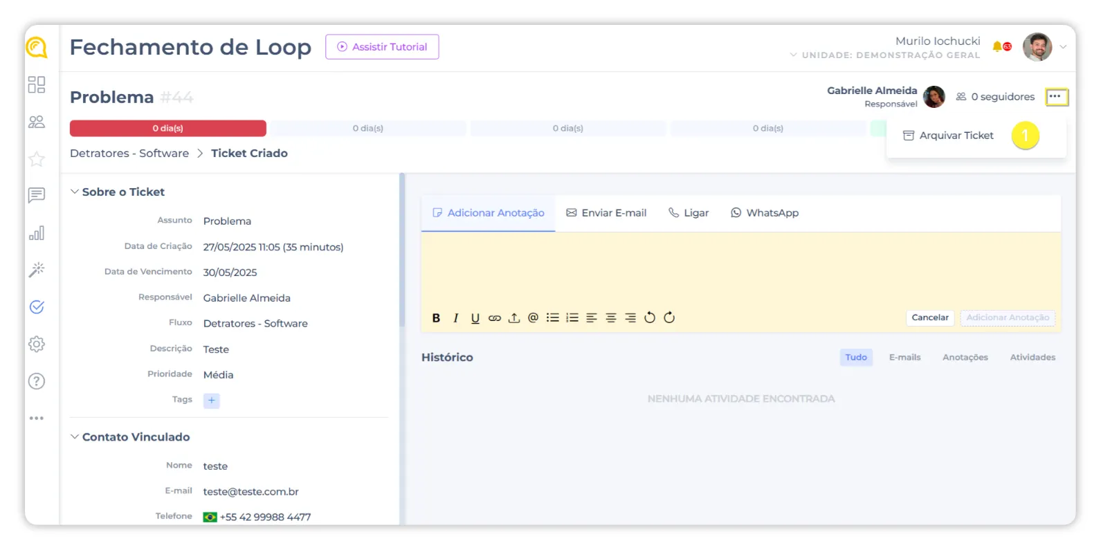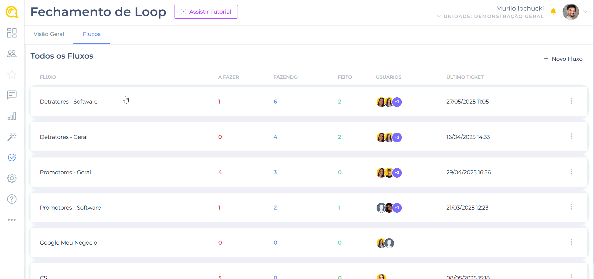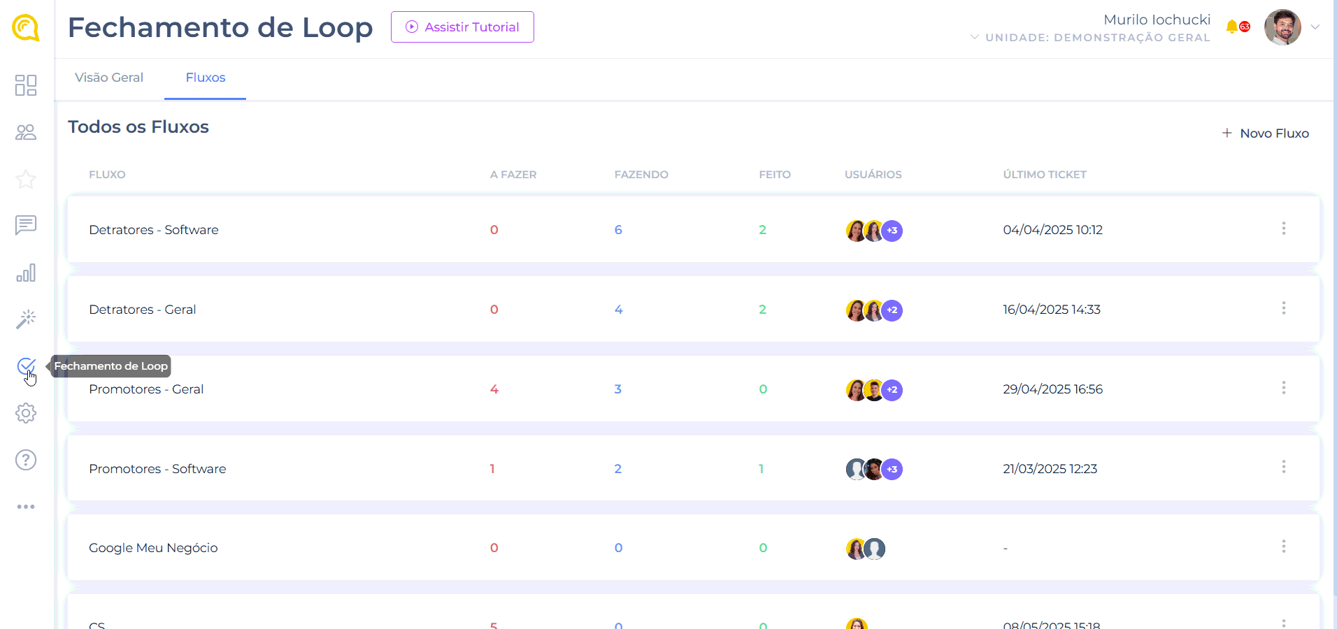 Após criar um fluxo no módulo Fechamento de Loop, você pode abrir e acompanhar tickets manualmente, mantendo a organização e rastreabilidade das ações de resposta aos clientes.