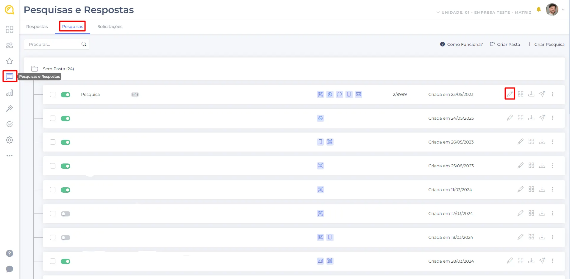Vá para a seção "Pesquisas" e selecione a pesquisa que deseja editar.