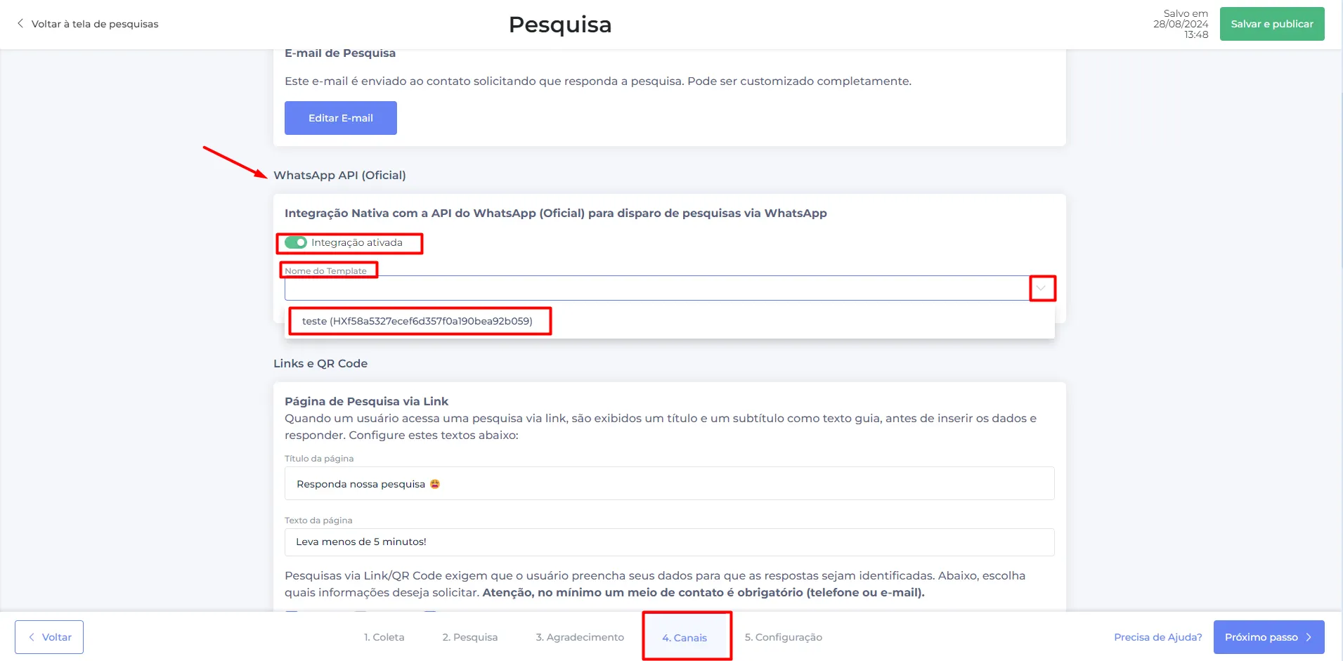 Ative a integração com o WhatsApp e selecione o template aprovado.