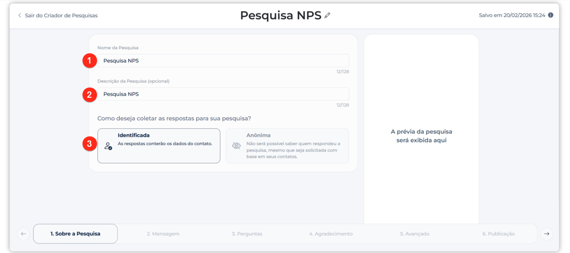 Identificação: escolha se a pesquisa será identificada (com nome do respondente) ou anônima.