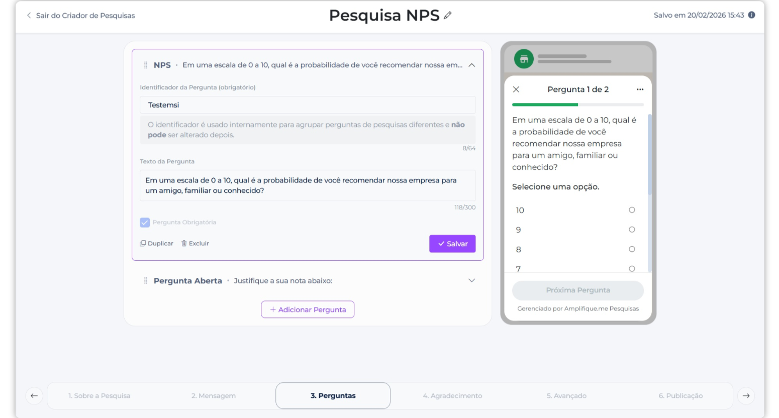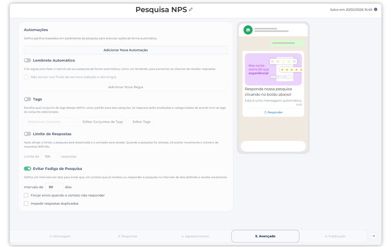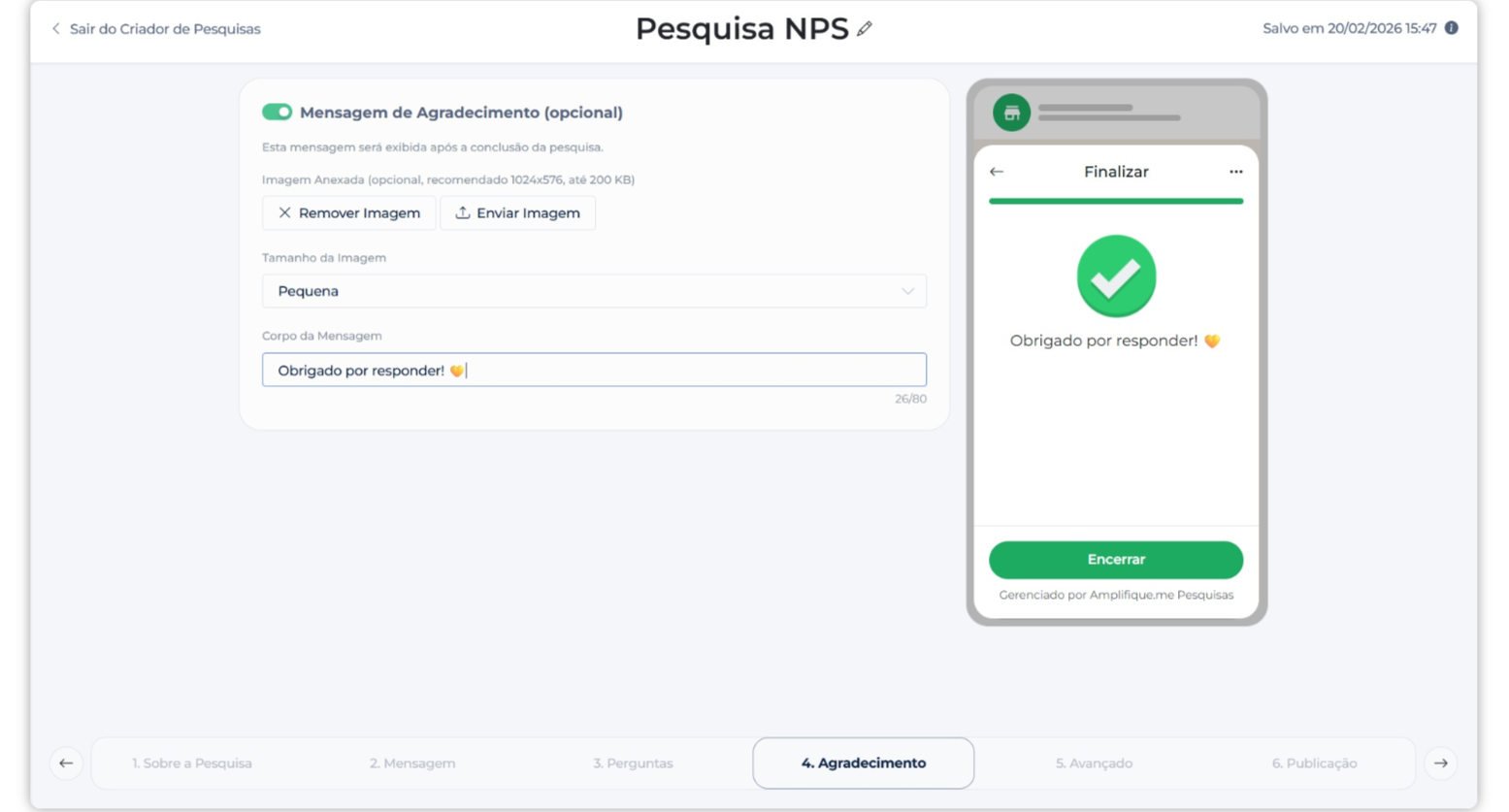 Você pode adicionar uma mensagem final personalizada (ex: “Obrigado por responder!”).