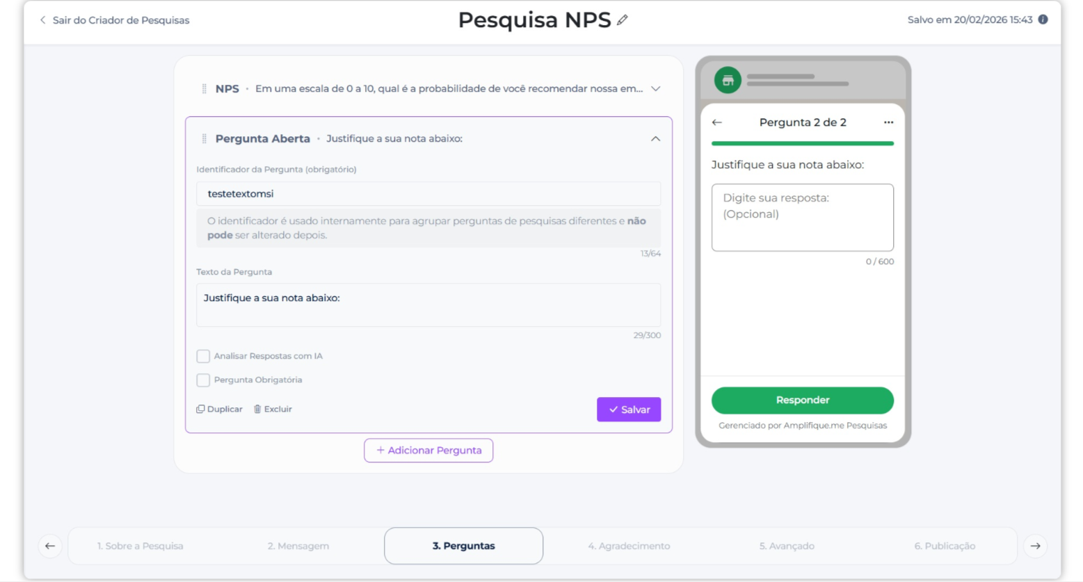 Também é possível adicionar perguntas de texto livre, com opção de análise via IA.