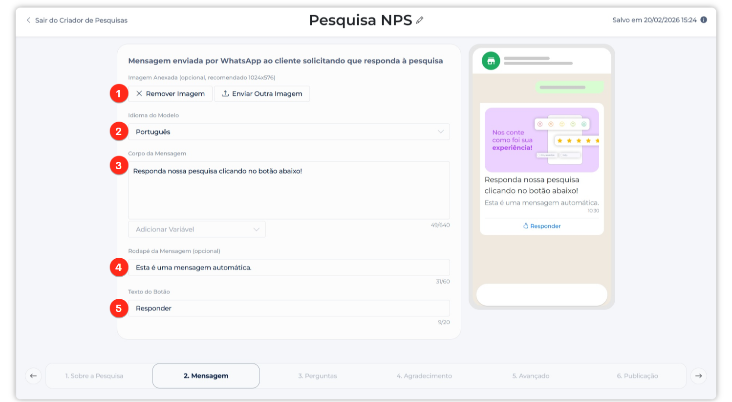 No WhatsApp Flows, não é possível usar condicionais (ex: “se a nota for menor que 6, mostrar pergunta X”). As pesquisas são lineares.