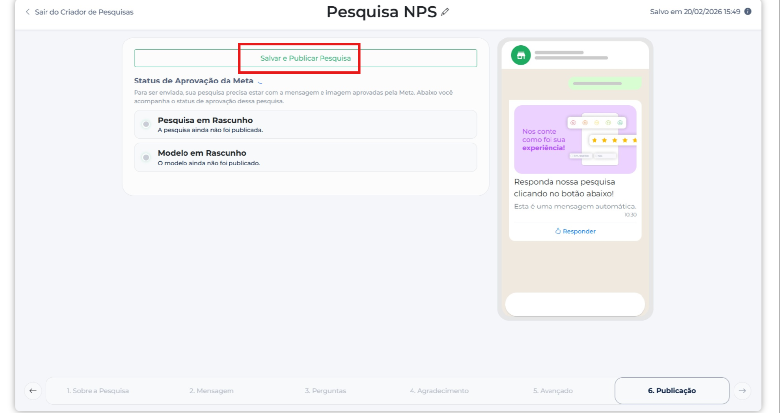 A pesquisa mudará para o status “Publicando”, enquanto aguarda aprovação da Meta.