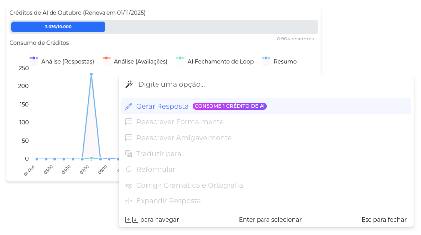 Para garantir maior controle, incluímos a opção de acompanhar o consumo de créditos de AI diretamente na opção Créditos de AI na tela de Configurações.