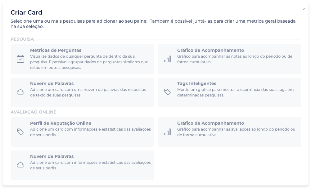 A mudança tem um motivo: agora é possível criar painéis personalizados combinando cards de avaliações online com cards de pesquisas. Por isso, o Painel Principal passa a se chamar apenas Painéis.