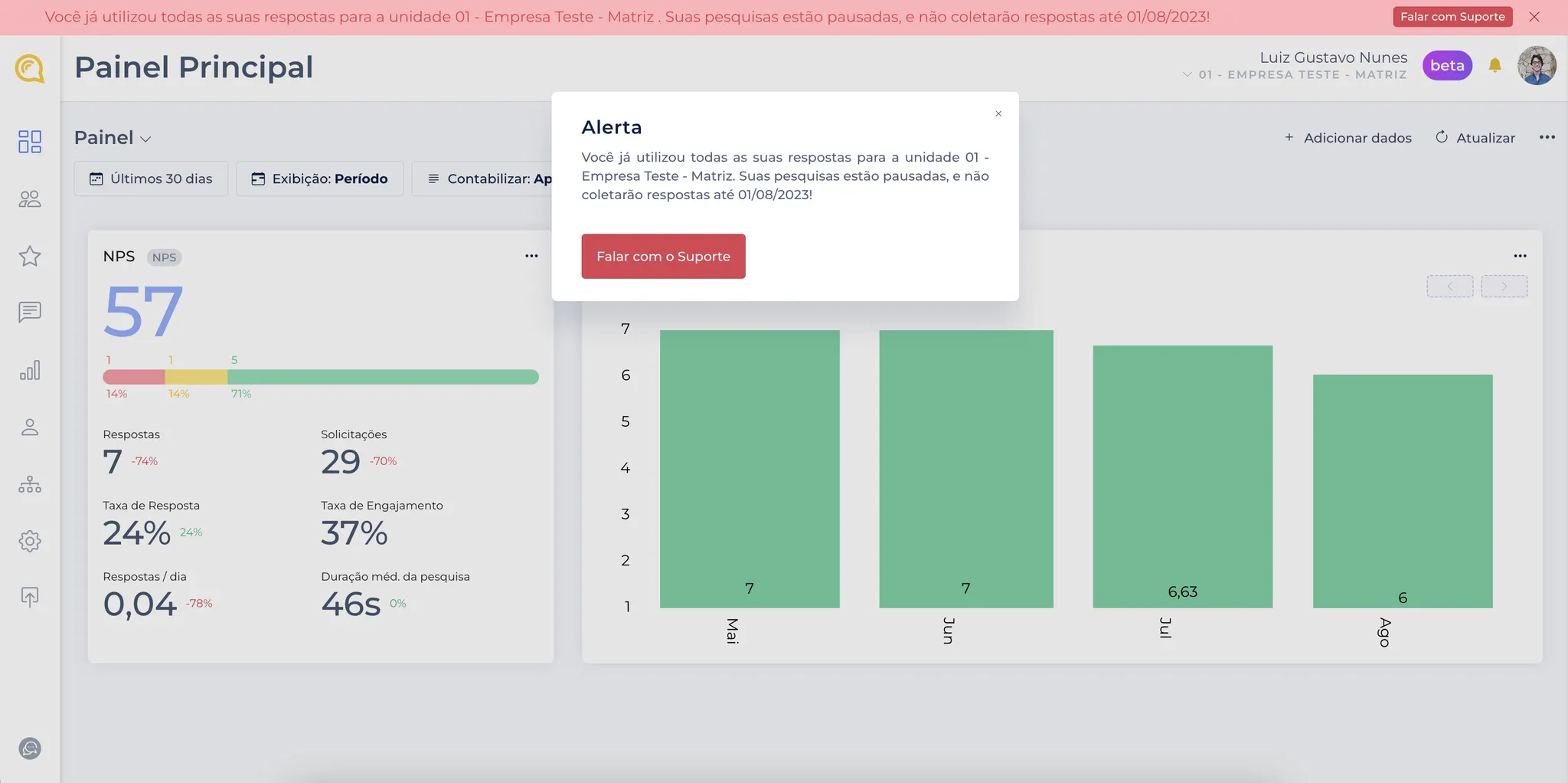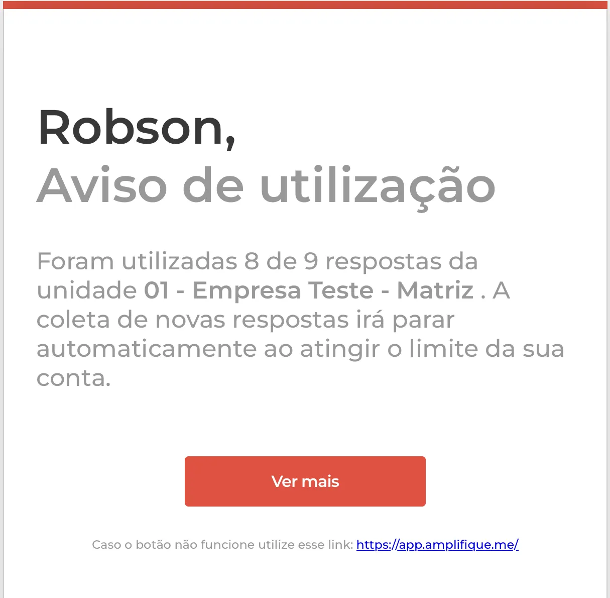Ao atingir o limite de respostas mensais da sua conta na plataforma da Amplifique.me, conforme o plano contratado para sua empresa, as pesquisas ativas nas respectivas unidades onde o limite foi atingido serão automaticamente paralisadas.