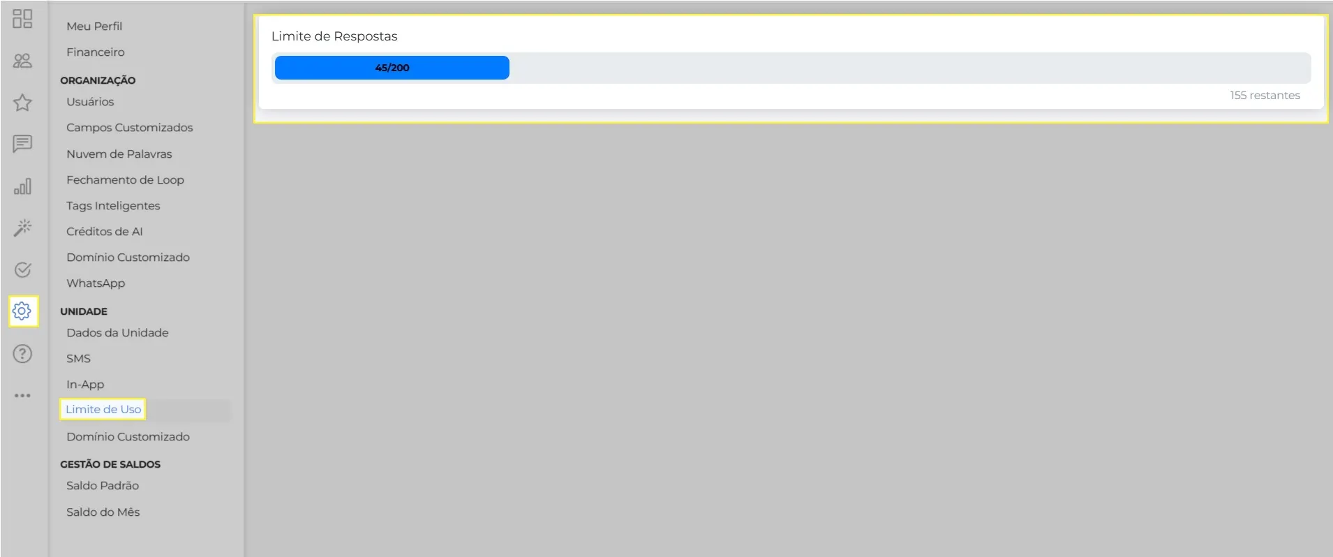 Na tela de Configurações (ícone da engrenagem, na barra lateral esquerda), acesse a opção “Unidade”. Ao final da página, em “Limites de Uso”, você verá o saldo utilizado vs. saldo disponível no ciclo mensal atual.