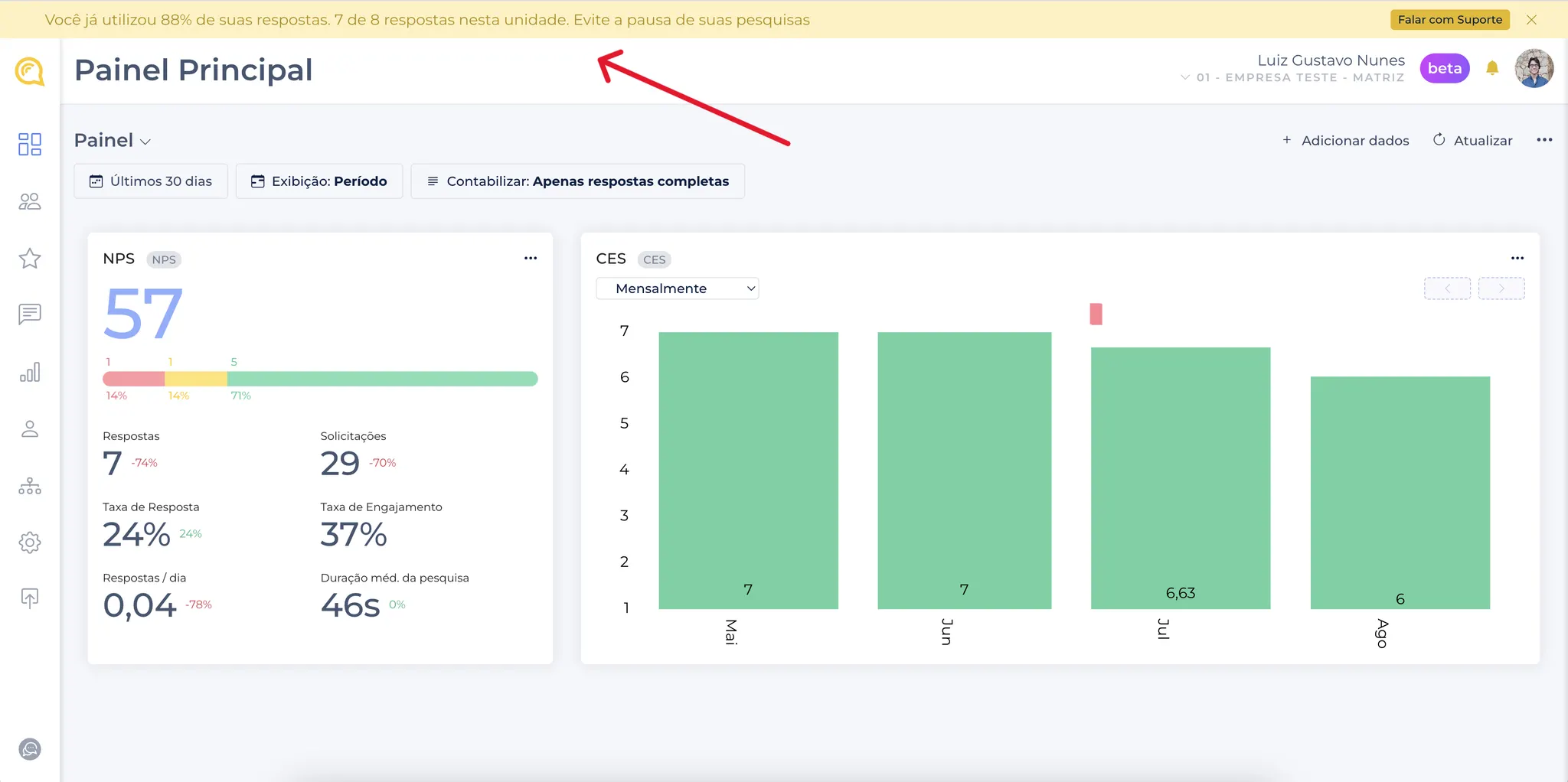 Usuários verão alertas diretamente na tela da ferramenta “Experiência do Cliente” sempre que a unidade atingir 80% de uso da franquia.