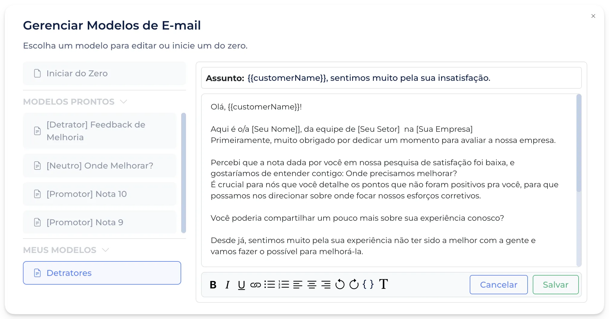 Os modelos de e-mail podem ser criados e editados diretamente do Criador de Pesquisas ou através da tela de Configurações, na seção Fechamento de Loop.