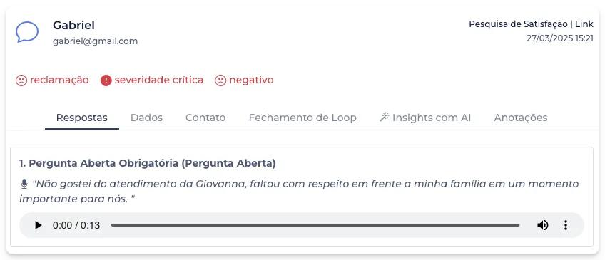 Toda resposta recebida via áudio é automaticamente transcrita utilizando um modelo avançado de inteligência artificial. Dessa forma, todos os recursos do Amplifique.me* Insights* aplicáveis às respostas em texto também são válidos para respostas em áudio, como classificação de sentimento, severidade, resumo, etc.