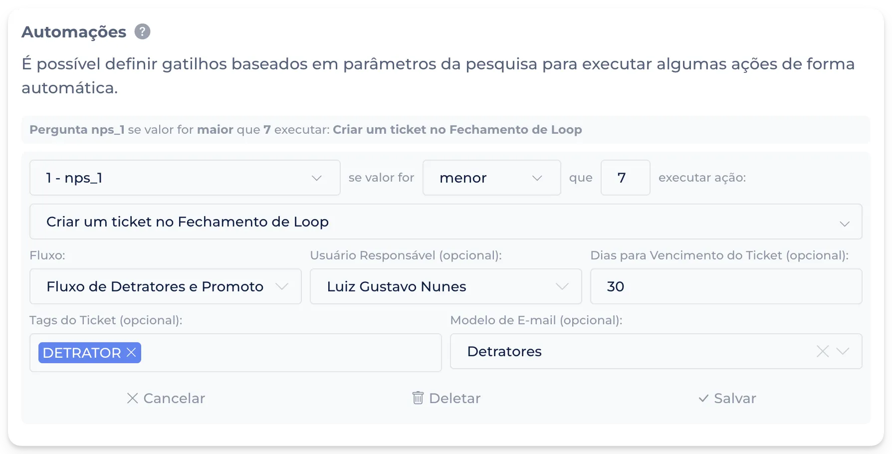 Agora é possível escolher um modelo de e-mail para enviar automaticamente a um usuário com base em condicionais, juntamente com a abertura de um ticket. A opção está disponível no quinto passo do Criador de Pesquisas.