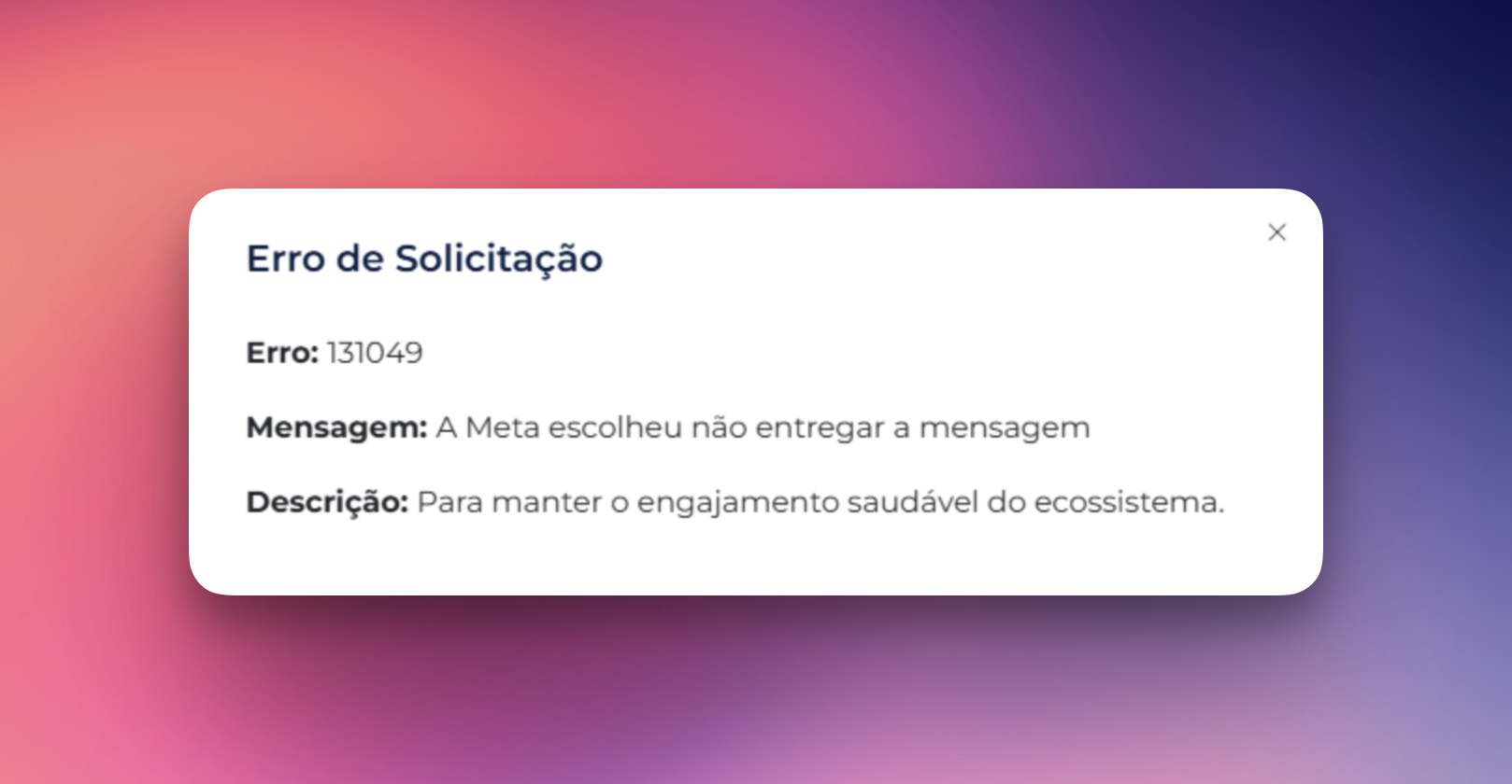 Esse erro é gerado pela própria Meta e não pode ser removido pela plataforma da Amplifique.me. Trata-se de uma política de proteção da experiência do usuário no WhatsApp.